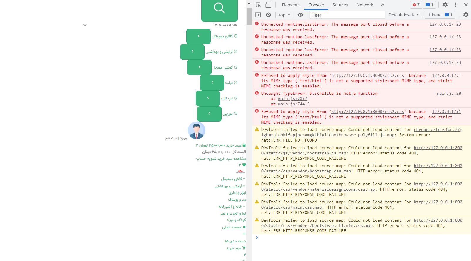 پروژه ی من تا دیروز خوب کار می کرد از امروز عکس ها بالا می آیند ولی سایت (روی سرور لوکال)درست بالا نمی آید . در کنسول نیز خطا هایی که در ضمیمه آوردم نشان می دهد . در ضمن خطای زیر نیز هنگام اجرا در پایچارم نشان می دهد .ممنون می شوم راهنمایی بفرمایید .