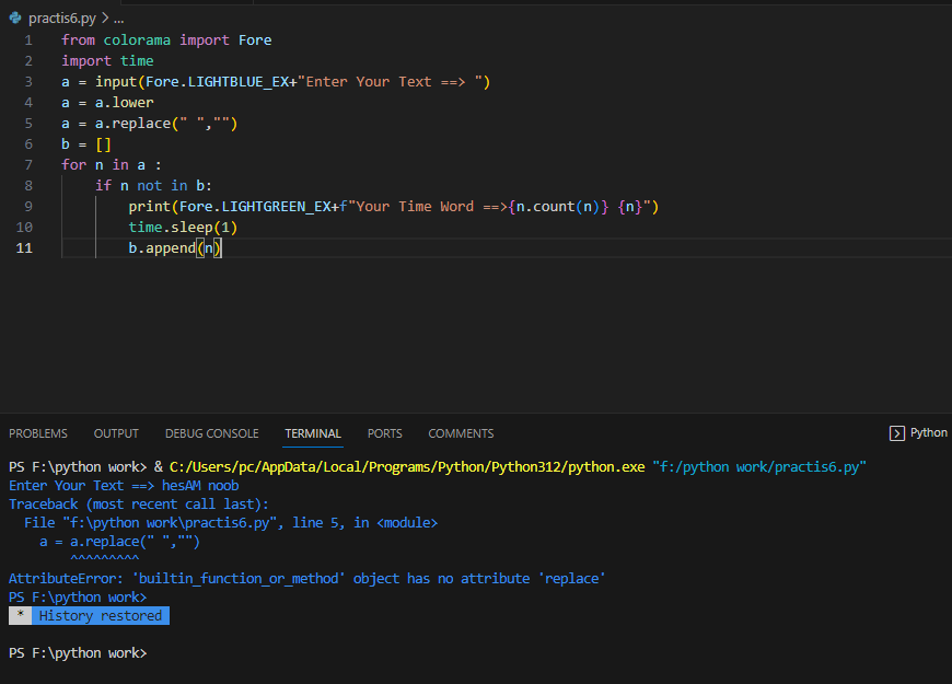 توی لاین چهارم یادتون رفته جلوی lower پرانتز بزارید و انگار عملا این فانکشن رو ریختید درون متغیر a نه مقدار خروجیش رو. و ارور هم اینو میگه که این فانکشن پیشفرض اتریبیوت replace رو نداره